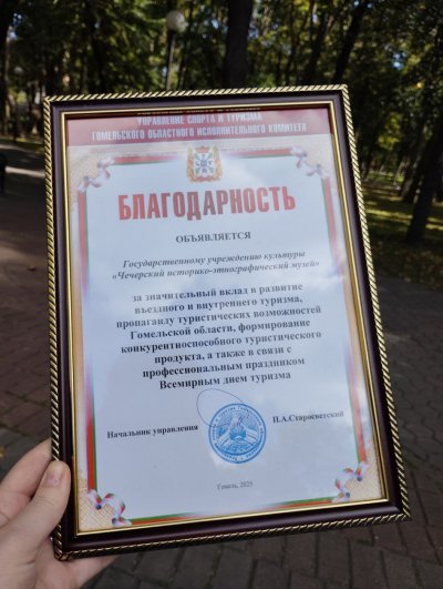 Накануне Всемирного дня туризма благодарность управления спорта и туризма Гомельского областного исполнительного комитета объявлена историко-этнографическому музею за значительный вклад въездного и внутреннего туризма, пропаганду туристический возможностей Гомельской области.